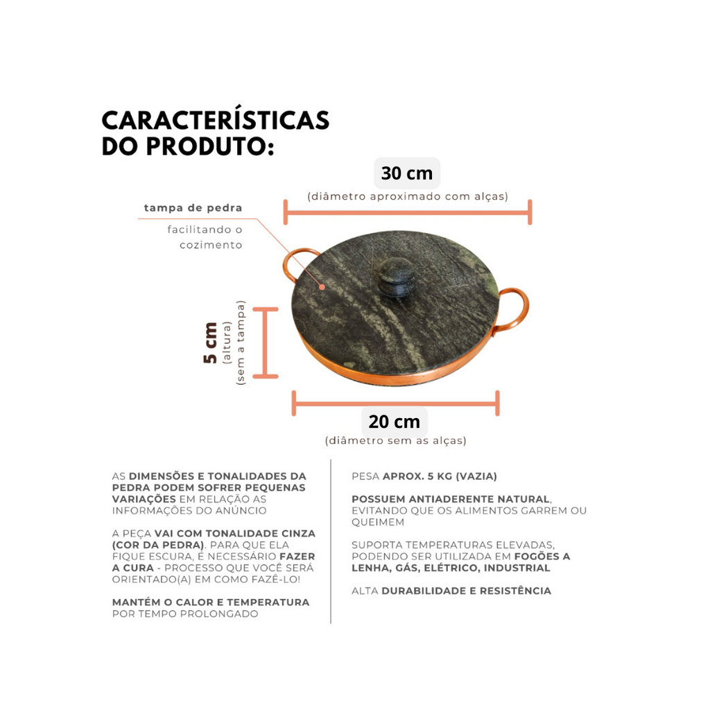 Além da funcionalidade, a Frigideira de Pedra Sabão é uma peça de decoração à parte. Seu acabamento artesanal com alças de cobre traz charme e sofisticação para qualquer ocasião, seja no dia a dia ou em encontros especiais com familiares e amigos.